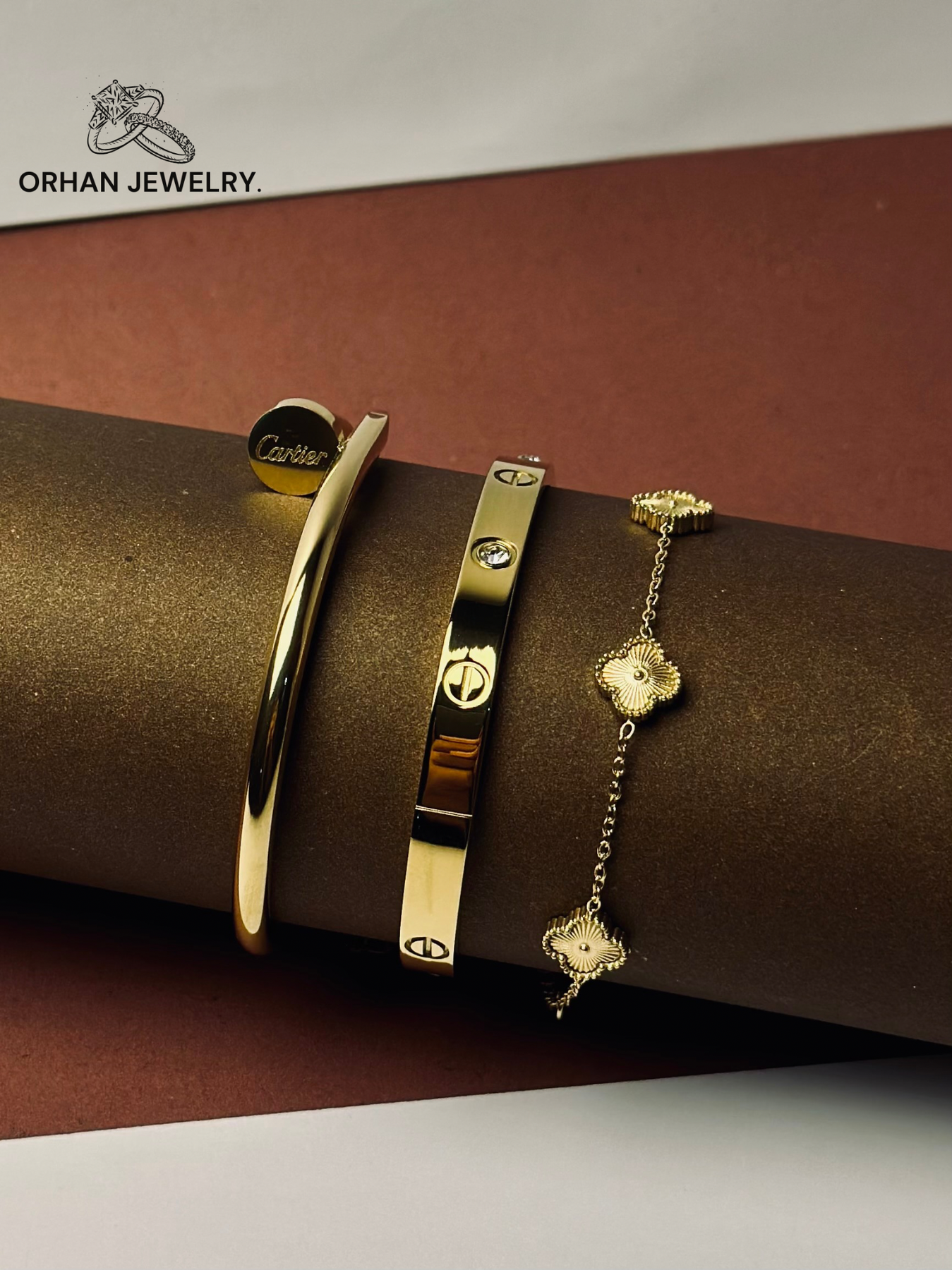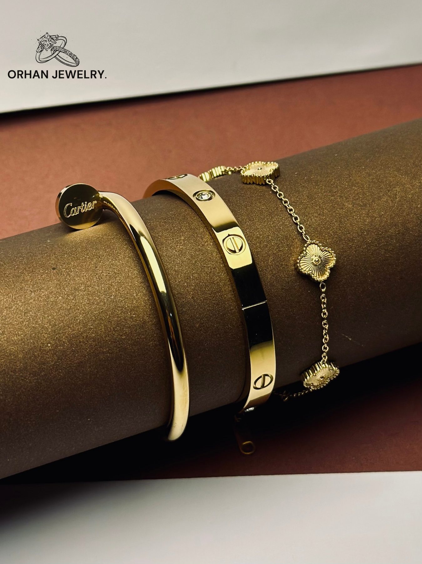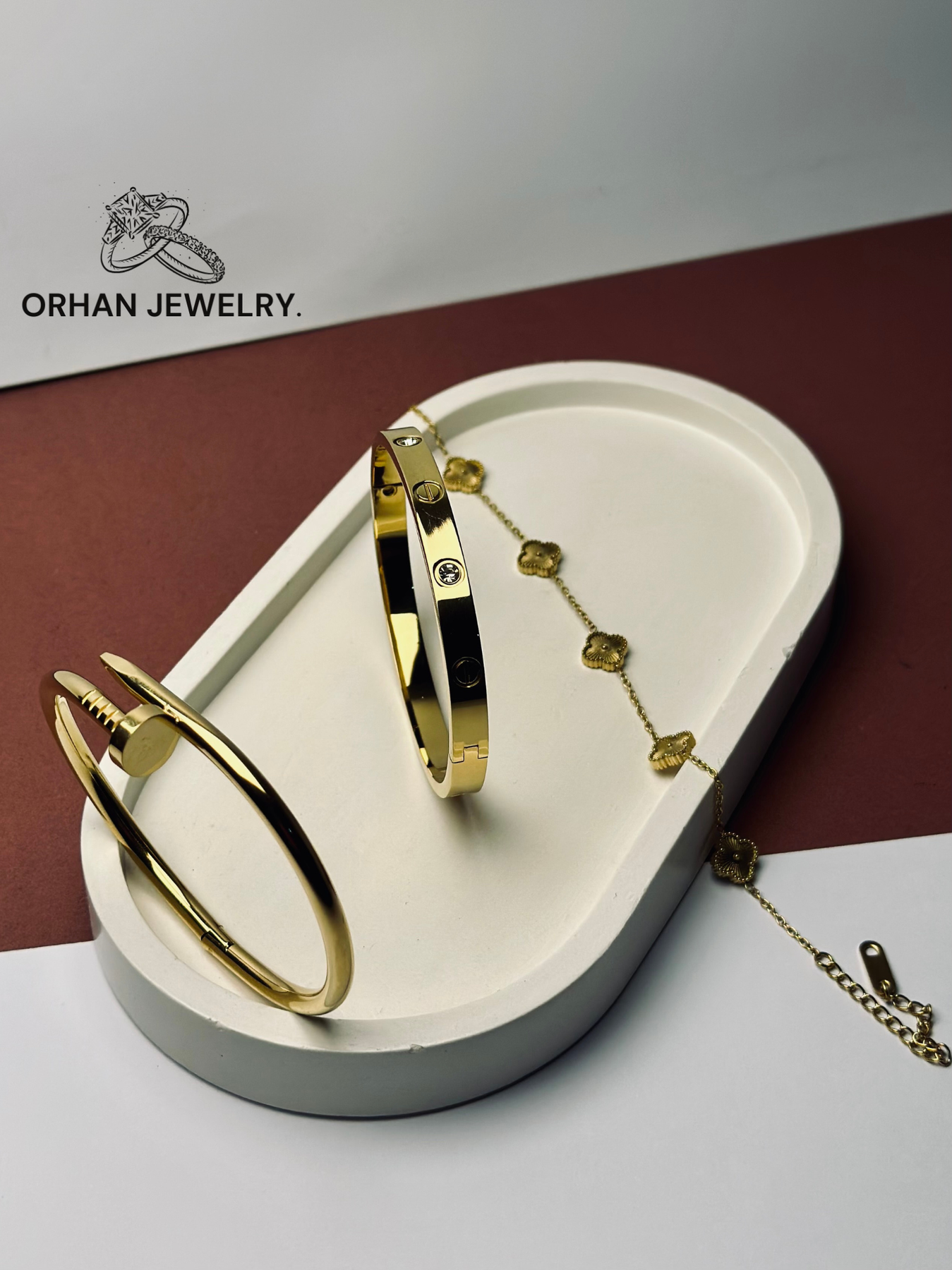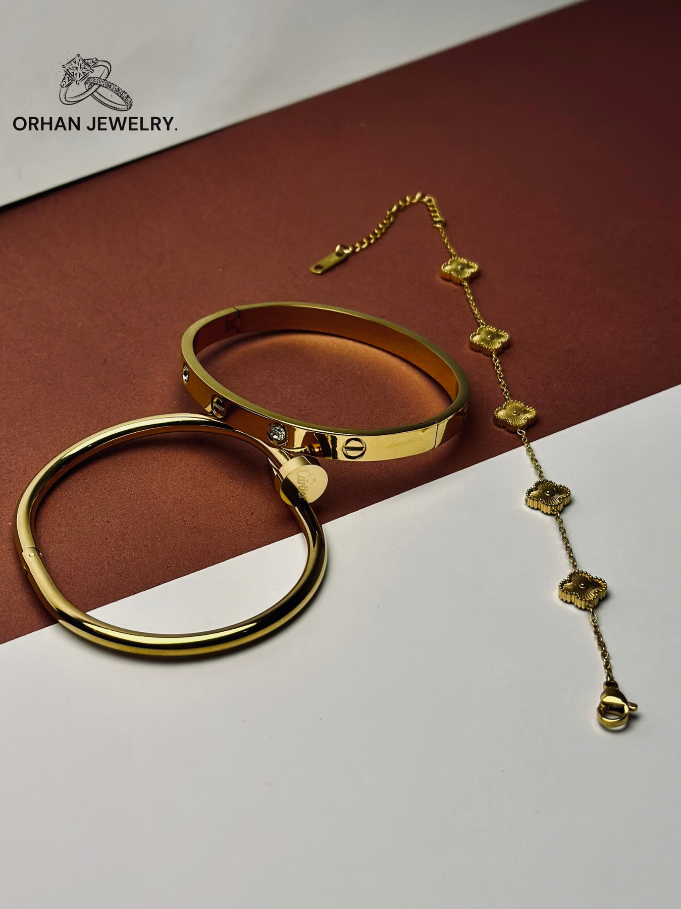 Discover the pinnacle of sophisticated accessorizing with this meticulously curated bracelet set, a collection that brings together the bold legacy of an iconic design with the enchanting symbolism of a timeless charm. This isn't just jewelry; it's a complete wrist narrative, telling a story of modern elegance, enduring quality, and a touch of serendipitous fortune. The set, comprising two legendary stainless steel bangles and a delicate gold clover bracelet, is masterfully designed to be worn as one, offering an instantly polished and deeply meaningful look without the effort of styling.